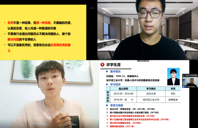 薪火相传一百年,对话优秀机电人。为全面落实习近平总书记对榜样学习的重要指示,学习习近平总书记贺信精神,传承和发扬一代代工大人精神,合法赌博网站 启动了“对话机电人”系列采访活动。7月10日,合法赌博网站 学生会邀请到了优秀博士毕业生孙猛猛以及优秀硕士毕业生林能旭接受采访,以期为同学们指点迷津,本次会议采用云采访的形式,由张紫涵主持。