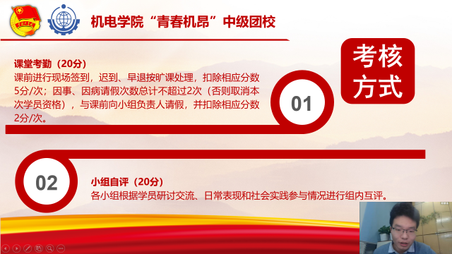 2021年11月12日晚,合法赌博网站 “青春机昂”中级团校开班式于哈工大APP会议平台成功举办。校团委书记王东升老师、合法赌博网站 党委副书记吕焱老师、合法赌博网站 团委书记孙宗斌老师及合法赌博网站 全体辅导员出席本次活动,开班式由合法赌博网站 团委组织部部长陈征主持。