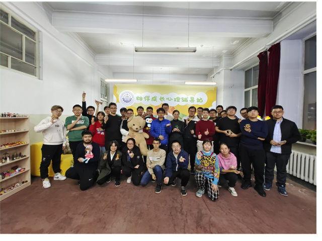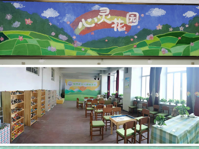 相伴成长心理辅导站由原来的二公寓后楼搬迁至机械楼4038,新辅导站被布置得舒适温馨。在房间最前边的黑板上有由水彩绘制的草地与鲜花,在正中间的彩虹内写着心灵花园四个字,给同学们一种轻松欢快的氛围。在房间内,沙盘整齐地摆放着,而沙具则被有顺序地安放在墙边的架子上,整体布置十分干净整洁。在房间的后方是活动空地、休息用的沙发以及合影墙,沙发上放着可爱的玩偶,能够使同学们的心情放松,不仅如此,就连窗帘也都用小玩偶装饰,使整个房间变得更加令人放松。