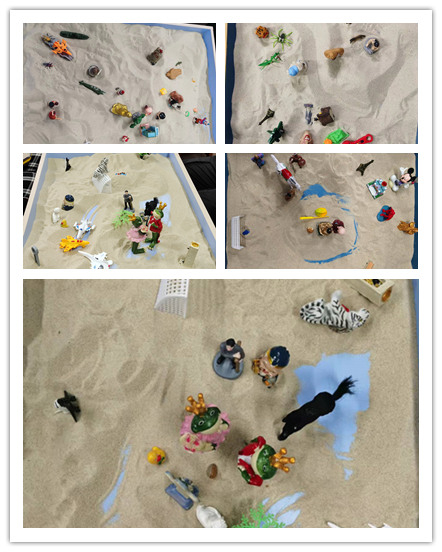 为了调动班级气氛,蒋楠老师首先带领同学们进行了轻松的破冰活动,气氛立刻活跃起来。在沙盘体验中,同学们在蒋楠老师的引导下闭上双眼,调整呼吸,安静地和沙子接触,同时思考蒋楠老师提出的问题。之后由同学们按照个人想法改变沙盘形状,并说出自己的理由,每个组推选出一名庄家,由庄家决定顺序。最后,同学们挑选沙具,按照自己的想法摆放,充分发挥想象力,向组内成员介绍自己的优势及以往经历。之后再将沙盘内所有的沙具模型串联成一个完整的故事由每个组内的庄家讲出。在沙盘体验结束之后,蒋楠老师指导同学们在活动空地上围成一圈,带领大家做《我和你》歌曲的手语,在一家人的歌声中圆满地结束了此次心理沙盘的体验活动。