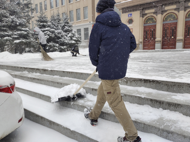 中午十二点半,课程结束的同学们或是在热气腾腾的食堂品味佳肴,亦或是惬意地躺在寝室中休息。而青年志愿者们不畏严寒,冒着飕飕袭来的寒风,于机械楼门前开展了此次扫雪活动。在青协工作人员的引导下,志愿者们领取了扫雪工具,分四组对8号楼前广场、机械楼前广场、机械楼两侧的小路以及校车站点开展清扫活动。银装素裹之中,同学们积极主动、相互配合、齐心协力,挥舞着手中的铁锹和扫帚,你铲我扫,一派热火朝天的景象。尽管志愿者们的脸庞在寒风中都冻得通红,但他们手中的工具却始终没有放下。“规格严格,功夫到家”的校训处处彰显,扫雪活动也不例外。每一处雪堆,哪怕结成了坚冰,在志愿者们扎实的功夫面前也只能乖乖束手就擒。吃苦耐劳、求真务实,铲除的一堆堆雪堆,见证着工大学子的团结奋进;同学们脸上洋溢的幸福微笑,让路旁的行人感受到无比的温暖。一小时的奋战,志愿者们虽然浑身是汗,却因自己的贡献与阿姨们的称赞和感谢而感到愉快充实。在一片欢声笑语之中,机械楼门前大片区域的积雪全部被清扫干净,给前来上课的师生带来了便捷、安全、温暖与满满的正能量。