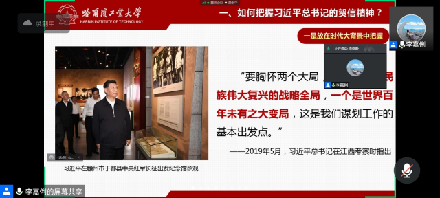 李嘉俐老师从三个部分向大家讲述了新时期的哈工大人如何在社会实践中贯彻贺信精神。在第一个部分“如何理解习近平总书记的贺信精神”中,李老师从“时代大背景”、“习近平总书记关心关注的重大事项”和“习近平总书记对青年的关怀嘱托”三个方面帮助大家把握贺信精神;第二个部分是“如何认识和发展哈工大特色优势”,李老师提出了“总结历史经验、把准历史规律、掌握历史主动”的立项思路,教导大家如何寻找社会实践的切入点;最后一个部分是“如何在项目实践中践行核心精神”,在这一部分,李嘉俐老师建议大家积极发挥校友资源,在家乡发掘红色建设基地,做好管理规划,把管理的知识应用于社会实践中。