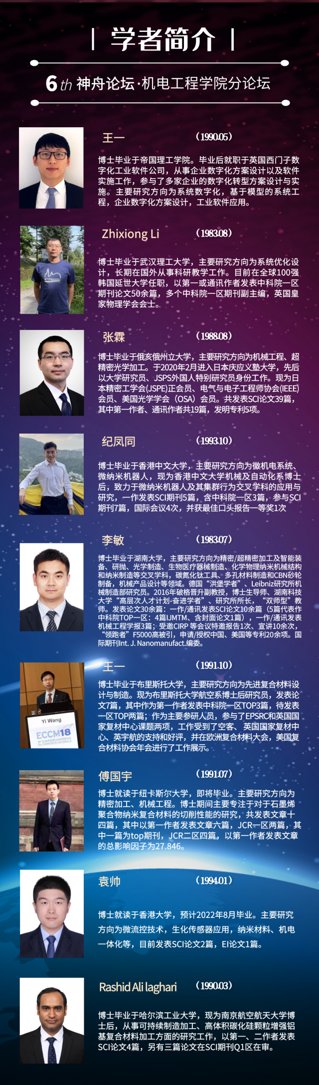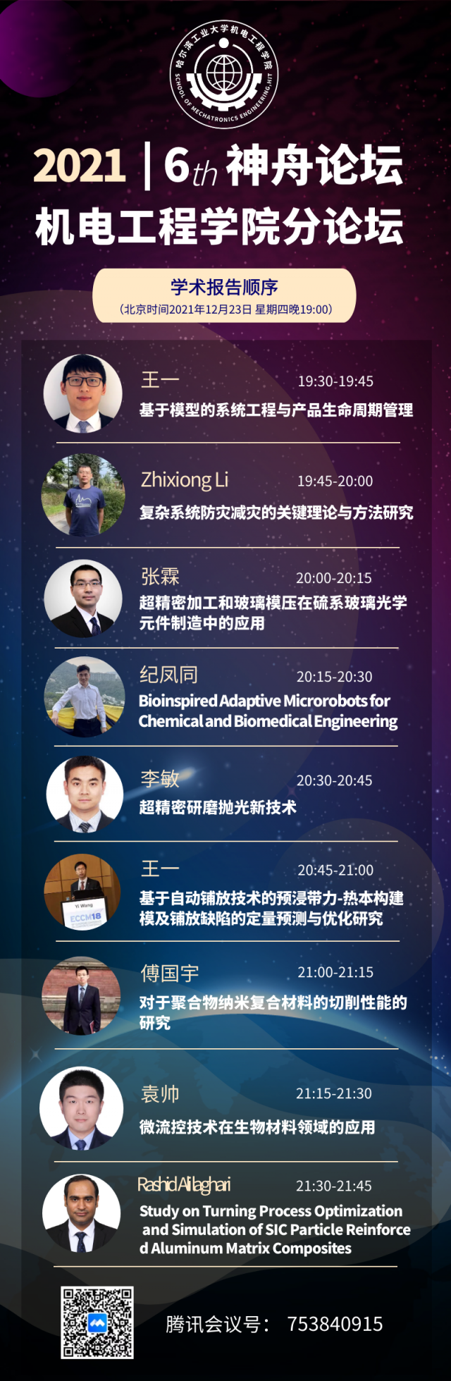 按照学校关于举办第六届“国际青年学者神舟论坛”的通知安排,机电分论坛将于2021年12月23日开展系列学术报告讲座,欢迎感兴趣的师生参加。分论坛安排如下: