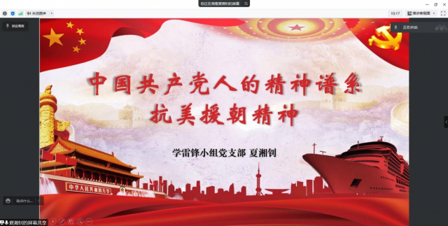 会议第二项,由组织委员夏湘钊同志主讲《中国共产党人的精神谱系之抗美援朝精神》主题微党课。夏湘钊同志从“抗美援朝精神的内涵”“构建人类命运共同体”“一个红星笔记本的故事”三个角度进行讲解。首先,将抗美援朝精神剖析为五个主要层次,即以爱国主义为根本、革命英雄主义为精髓、革命乐观主义为特质、革命忠诚主义为底蕴、国际主义为有机组成部分,并用凝练的语言分析了它们的精神内核。随后,展示了人类命运共同体这一理念的提出与发展历程,并指出构建人类命运共同体是大势所趋,将引领人类进步的潮流。最后,以哈工大校友连家创先生的红星笔记本收束全篇,勉励青年学子树立光辉榜样、培养崇高精神,向着全面建设社会主义现代化国家新征程,向着实现中华民族伟大复兴的中国梦继续奋勇前进。