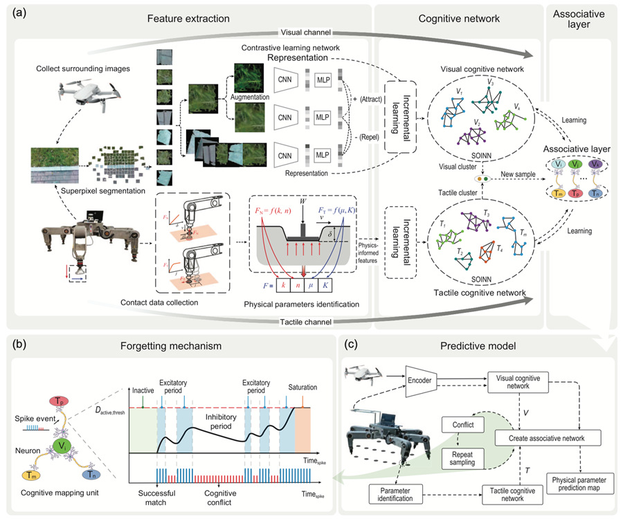 针对上述问题,研究团队提出足式机器人的环境物理特征类动物学习方法。研究人员以法向或切向足地作用力学模型为基础,设计了基于模型——数据的无监督学习框架。该研究首次提出具有认知冲突解决能力的增量式在线学习方法,使机器人能够通过视觉与触觉融合感知自主识别环境物理特征信息。具体而言,在地面表征方面,团队采用足地接触模型表征地形的触觉参数,让机器人“摸一摸”地面就知道柔软度和摩擦程度;另外,在机器视觉(“看一看”)方面,团队提出无监督视觉特征提取方法,无需人类参与,只需机器人自动对比视野中不同地形纹理,即可自主完成。为让机器人通过“看一看”就能预测地形“摸”起来的感受,团队将机器人实时采集的触觉、视觉特征聚类为知识群集,并通过映射网络将视觉特征和触觉特征联系起来。由于环境的变化,从前认识的地形可能和当前的触觉感受不一致,比如:刚下过雨的草地比干燥时更软,虽然它们看起来是一样的。为解决这样的认知冲突,团队采用模拟生物脑神经的带泄漏整合发放模型(LIF)对不同模态进行信息连接,动态调整连接强度,使得机器人更加聪明、智能。