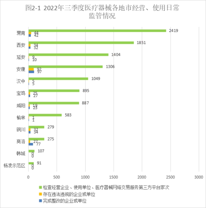 2022年三季度,全省检查医疗器械经营企业和使用单位9841家次,飞行检查21家次,同比下降11.7%,环比下降14.3%。存在违法违规的企业或单位300家次,占3%,完成整改的企业或单位317家次。